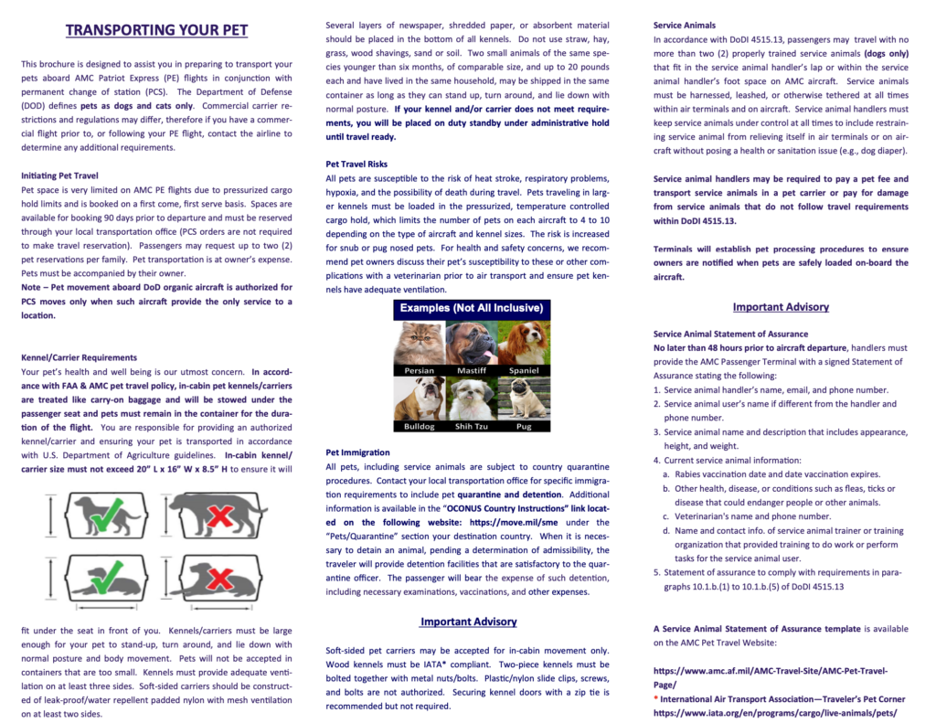 Airlines (including the Patriot Express) have varying restrictions for how to travel with pets. For example, as of 2020, Lufthansa no longer transports snub-nosed animals in the cargo hold.